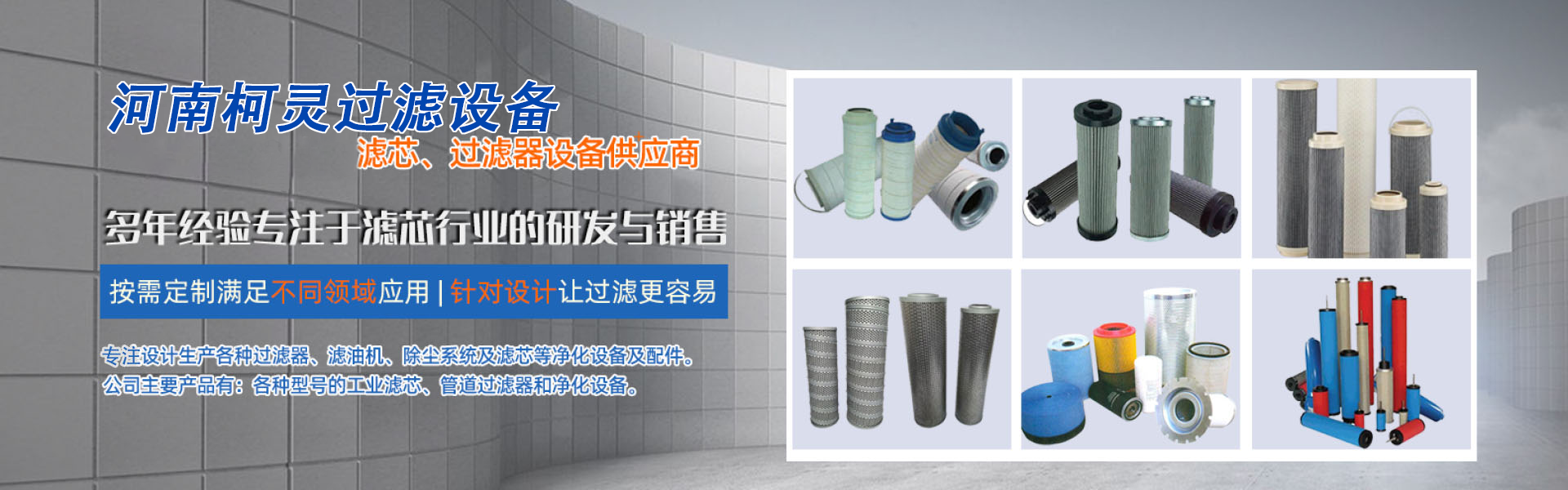 公司主要产品有:钢厂滤芯、电厂滤芯、煤机滤芯、空气滤芯、燃油/液压油滤、油气分离器、水滤等工业滤芯;各种型号的高、中、低压管道过滤器、滤油机以及反冲洗式水过滤器等净化设备 1600 余种。 替代国外系列如 PALL(颇尔)、HYDAC(贺德克)、VICKERS(威格士)、STAUFF(西德福)、REXROTH(力士乐)、PARKER(派克)等滤芯,服务行业包括冶金、电力、水泥、矿山、石油装备、工程机械、石化、煤矿以及金属矿开采等。我们可提供系列标准化过滤与净化产品,也可根据客户需求定制产品和服务。过滤单元改造,完整容器和成套系统加工制造等,更能反映我们的综合技术和服务实力。